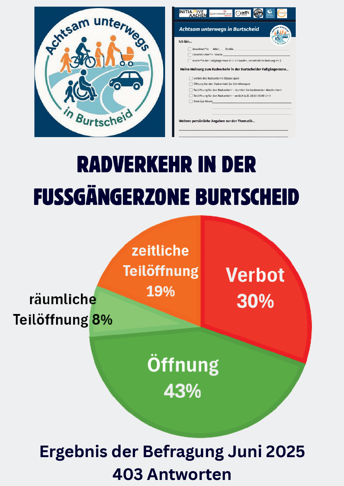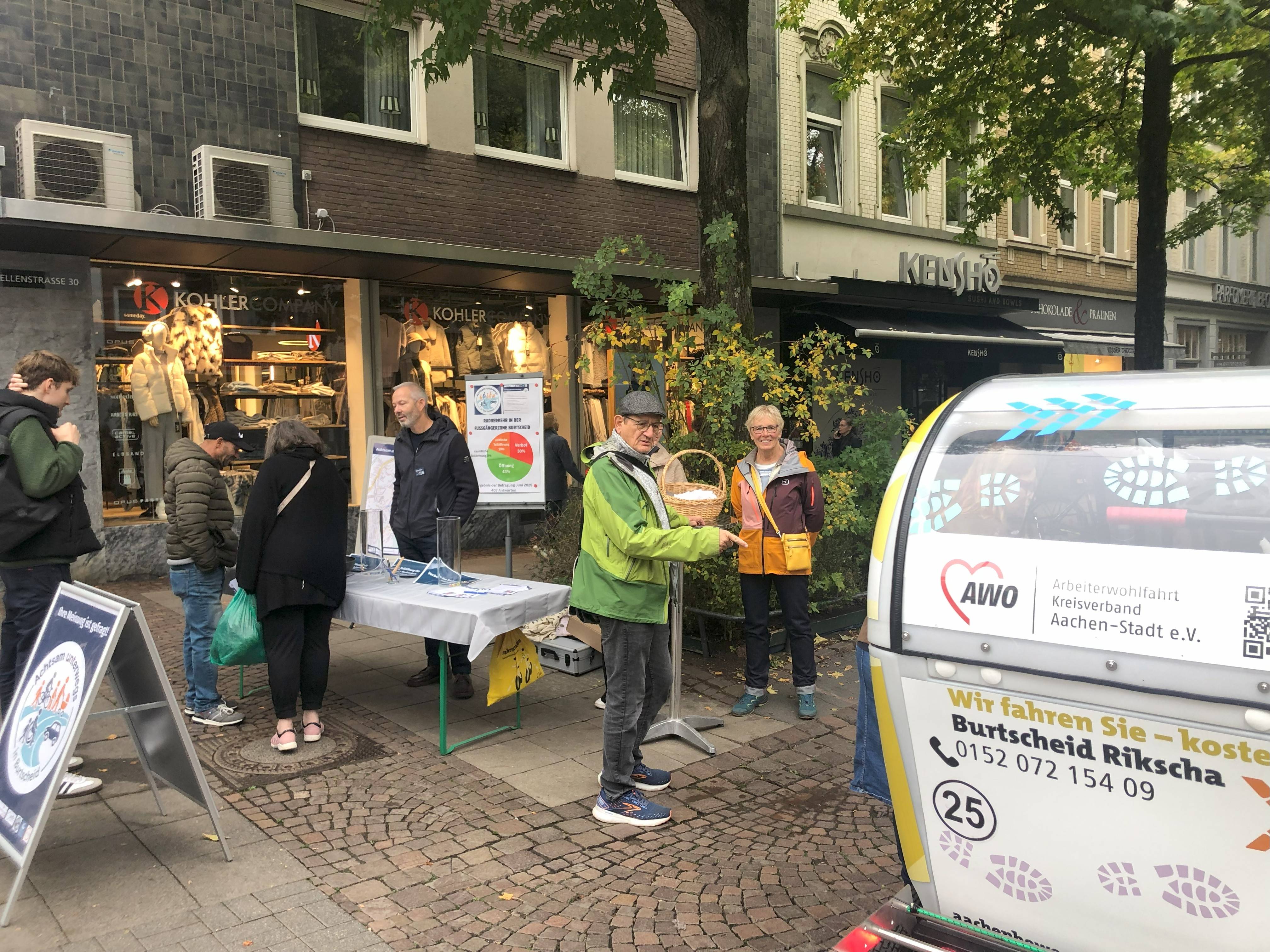 Die Ergebnisse der Fragebogenaktion vom 10.7.2025 werden präsentiert und die Inititatoren stellen sich der Diskussionm. Mit kleinen Präsenten aus Burtscheid wird vorbildliches Verhalten der Fahrradfahrer belohnt.