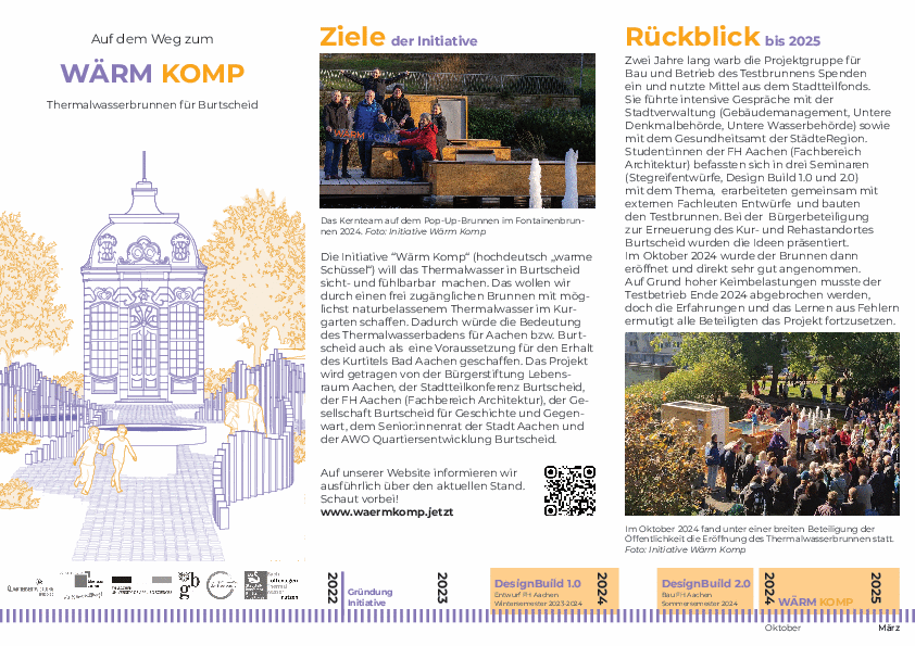 Die Initiative Wärm Komp hat eine umfangreiche, bebilderte Dokumentation zusammengestellt. Sie umfasst sowohl den historischen Hintergrund, den Blick auf das Vorbild aus Baden (Schweiz), als auch Planung und Bau des Pop-up-Thermalbrunnens, sowie die Erfahrungen zum Badebetrieb und dem vorzeitigen Abbruch.