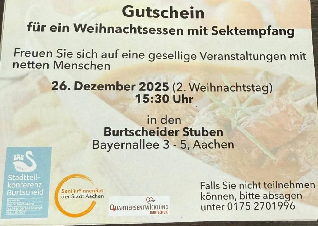 Am Zweiten Weihnachtstag, dem 26. Dezember 2025, organisierten Bibi Roth, Martin Landrock (Seniorenrat Burtscheid) und Astrid Siemens (Sprecherin der Stadtteilkonferenz Burtscheid AKÜ50) einen herzlichen Weihnachtsnachmittag für Seniorinnen und Senioren aus Burtscheid. Die Arbeiterwohlfahrt Burtscheid öffnete dafür ihre Räume.