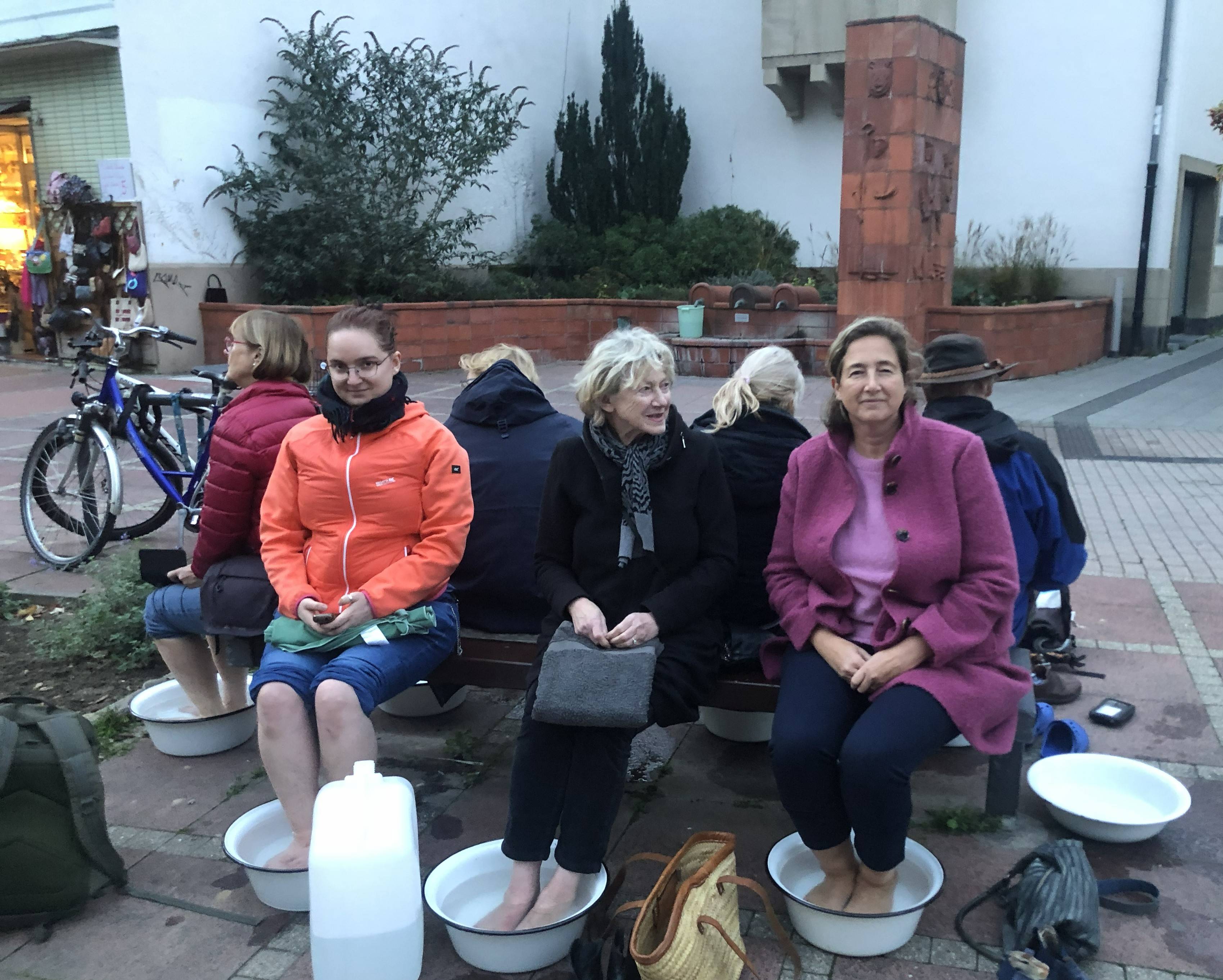 Kompen am Burtscheider Markt. Teilnehmer*innen einer VHS-Veranstaltung „Wasserführungen“ genießen das Fußbaden in warmem Burtscheider Thermalwasser (Foto K.-P.Otto)