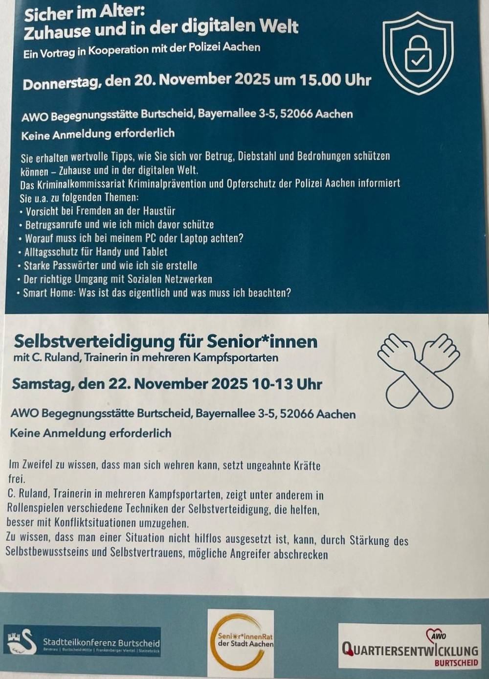 Nachbarschaftshilfe-Seminar des AK Seniorengerechter Stadtteil in Kooperation mit der AWO Quartiersentwicklung Burtscheid, dem Seniorenrat der Stadt Aachen und der AOK Rheinland/Hamburg im Rahmen der Alzheimertage am 21. September 2023 on der: AWO Begegnungsstätte Burtscheid, Byernallee 3-5, 52066 Aachen