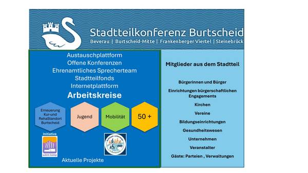 Wozu: Zusammen mit Bürgerinnen und Bürgern und Vertretern der Vereine, Einrichtungen der Bildung, Gesundheit, Pflege, Kultur etc. und Unternehmen aus dem Stadtteil dient sie der Beratung von Herausforderungen und Ideen. Sie steht im Dialog mit Verwaltung und Politik. zur Vorstellung der Stadt Aachen siehe
