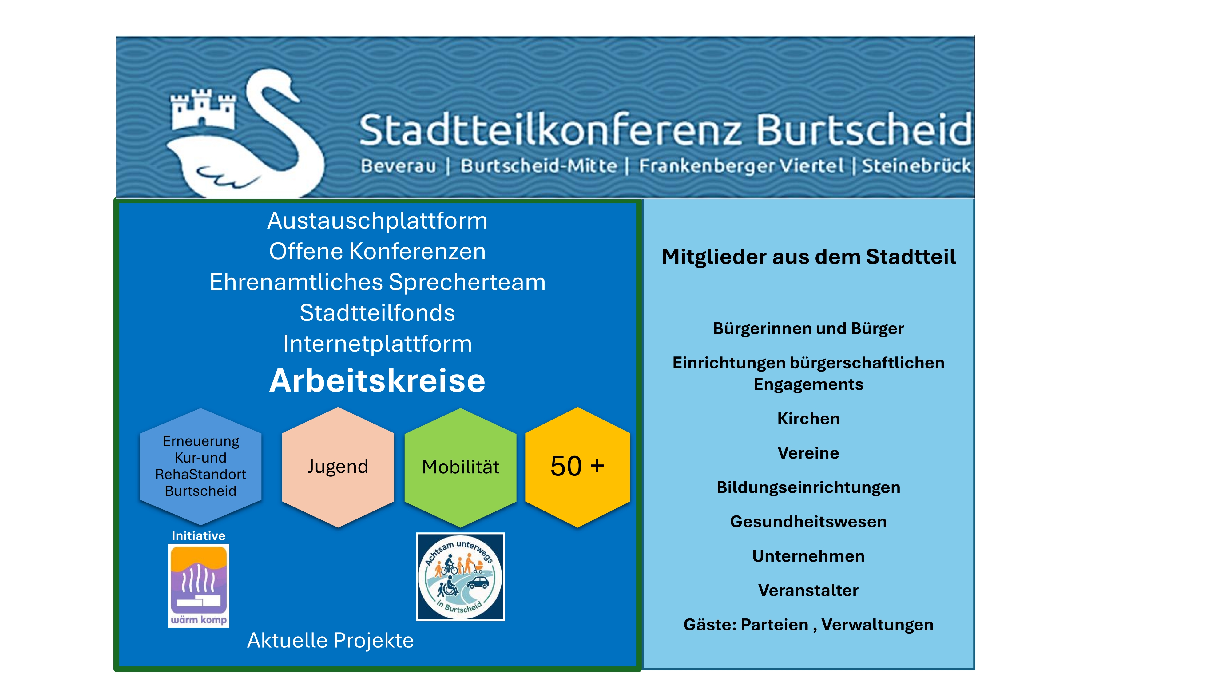 Wer: Mitglieder sind Vertreterinnen und Vertreter aller Institutionen, Verbände, Vereine, Gemeinschaften bürgerlichen Engagements, Bildungseinrichtungen, Unternehmen, Religionsgemeinschaften sowie Pflege-, Gesundheits- und Betreuungseinrichtungen, die im Stadtteil arbeiten und einen Beitrag zum sozialen Leben im Stadtteil leisten, sowie dort wohnende interessierte Bürgerinnen und Bürger. ⇒siehe Mitglieder